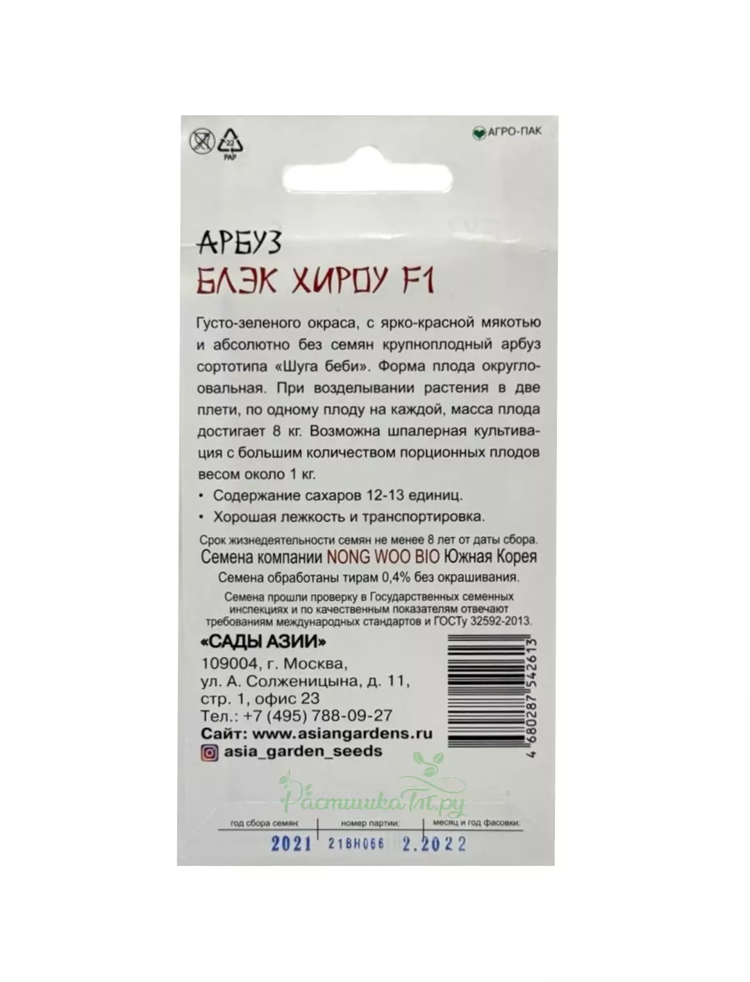 Густо черно-глянцевый с ярко- алой мякотью, без единого семечка, крупноплодный арбуз сортотипа Шуга Беби. Форма плода круглая и овальная. Если выращивать растение на двух плетях, по одному на каждой, то масса плода может достигать 8 килограммов. Возможна также шпалерная культура с большим количеством мелких порционных плодов по 1 килограмму. Содержание сахаров составляет 12–13 единиц, а плоды хорошо хранятся и легко транспортируются.