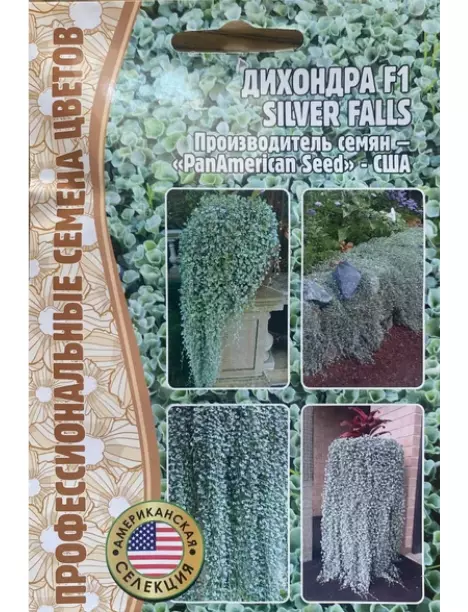 Дихондра Сильвет Фалс - это прекрасное растение с серебристыми, круглыми листочками, которые напоминают монетки. Его длинные побеги могут достигать до 180 сантиметров и свисать вниз из подвесных кашпо, создавая впечатление настоящего водопада зелени. Это делает этот сорт идеальным для создания уникальных ландшафтных композиций. Адаптируется к засухе и использоваться для украшения садов или альпинариев. Она также хорошо сочетается с другими растениями, такими как петунии, вербена, лобелия и бальзамине.
