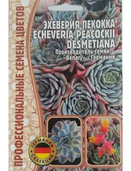 Эхеверия Пеакоцкого - имеет фиолетовую,сине-белую плотную мясистую розетку (до 11см в диаметре и высотой 20см) с 50-60листьями, скрученными в несколько спиралей. Листья продолговато-яйцевидные (овальные контуры похожи на яйцо) и заостренные на конце. Расцветка куста голубовато-серая, но при достаточном освещении растение приобретает более светлый оттенок синего и фиолетового. Цветки появляются в кистовидных соцветиях и распускаются постепенно снизу вверх, в результате чего цветение продолжается многие недели. Окраска цветков преимущественно оранжево-желтая, а также розовая и шарлахово-красная.