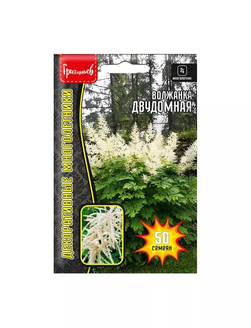 Двудомная волжанка вырастает до 2 м высотой. Отличается растение длинными ровными стеблями. При правильном уходе куст разрастается в диаметре до 1,5 м.. Листья у Волжанки ажурные, рваной формы, соцветия собрат ты в метелки белого от тенка длит той более 50 см. Осенью ее листья становятся насыщенного красного цвета и долгое время не опадают. Волжанка отлично переносит затенение и высокую влажность. Требования к грунту у неё минимальные - она любит легкие, хорошо дренируемые почвы.