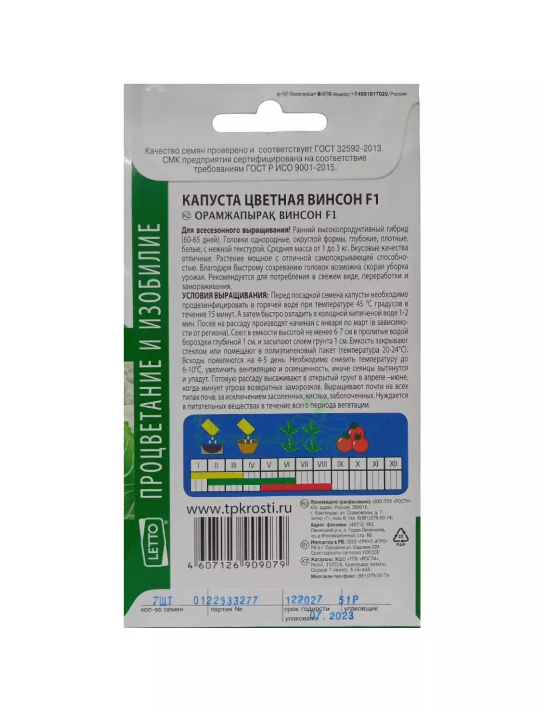 Ранний высокопродуктивный гибрид 60-65 дней. Головки однородные, округлой формы, глубокие, плотные, белые, с нежной текстурой. Средняя масса от 1 до 3 кг. Вкусовые качества отличные. Растение мощное с отличной самопокрывающей способностью. Благодаря быстрому созреванию головок возможна скорая уборка урожая. Рекомендуется для потребления в свежем виде, переработки и замораживания.