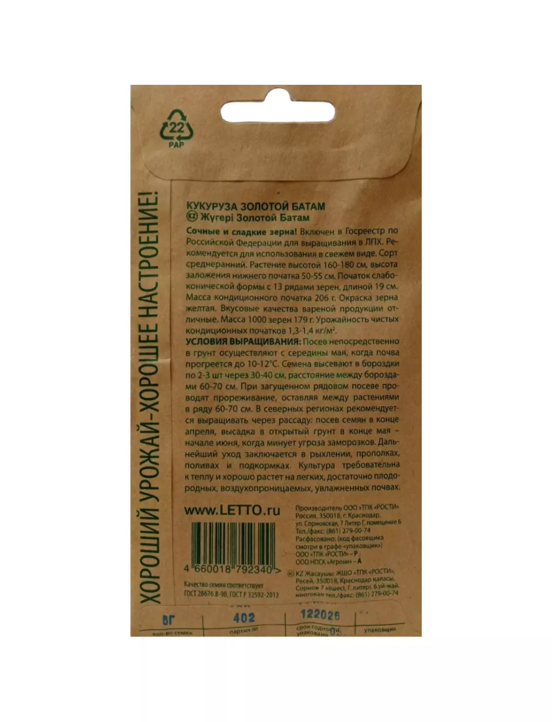 Рекомендуется для использования в свежем виде. Сорт среднеранний. Растение высотой 160-180 см, высота заложения нижнего початка 50-55 см. Початок слабо-конической формы с 13 рядами зерен, длиной 19 см. Масса кондиционного початка 206 г. Окраска зерна желтая. Вкусовые качества вареной продукции отличные. Сочные и сладкие зерна.