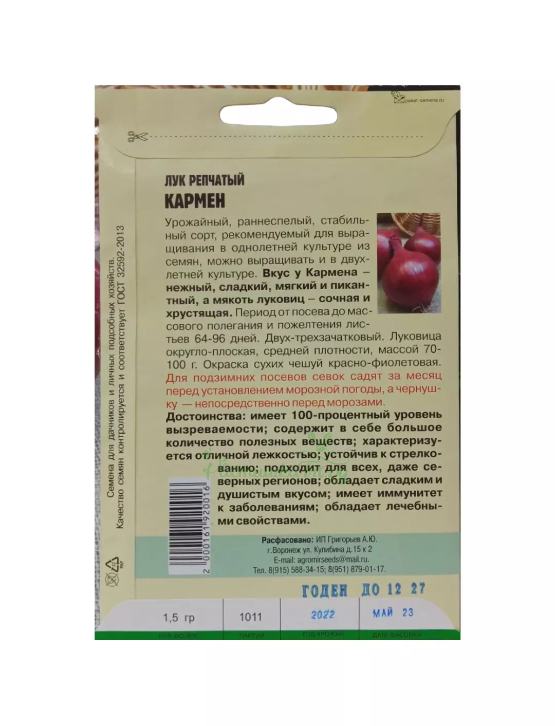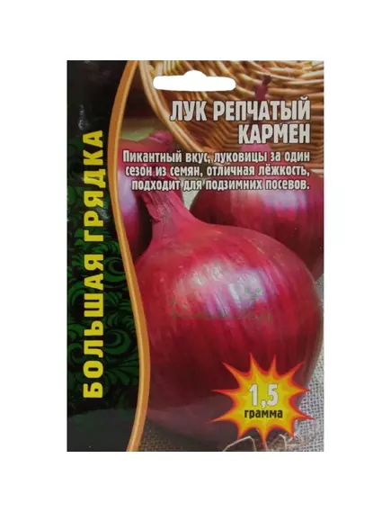 Вкус у Кармена - нежный, сладкий, мягкий и пикантный, а мякоть луковиц - сочная и хрустящая. Период от посева до массового полегания и пожелтения листьев 64-96 дней. Двух-трехзачатковый. Луковица округло-плоская, средней плотности, массой 70- 100 г. Окраска сухих чешуй красно-фиолетовая.