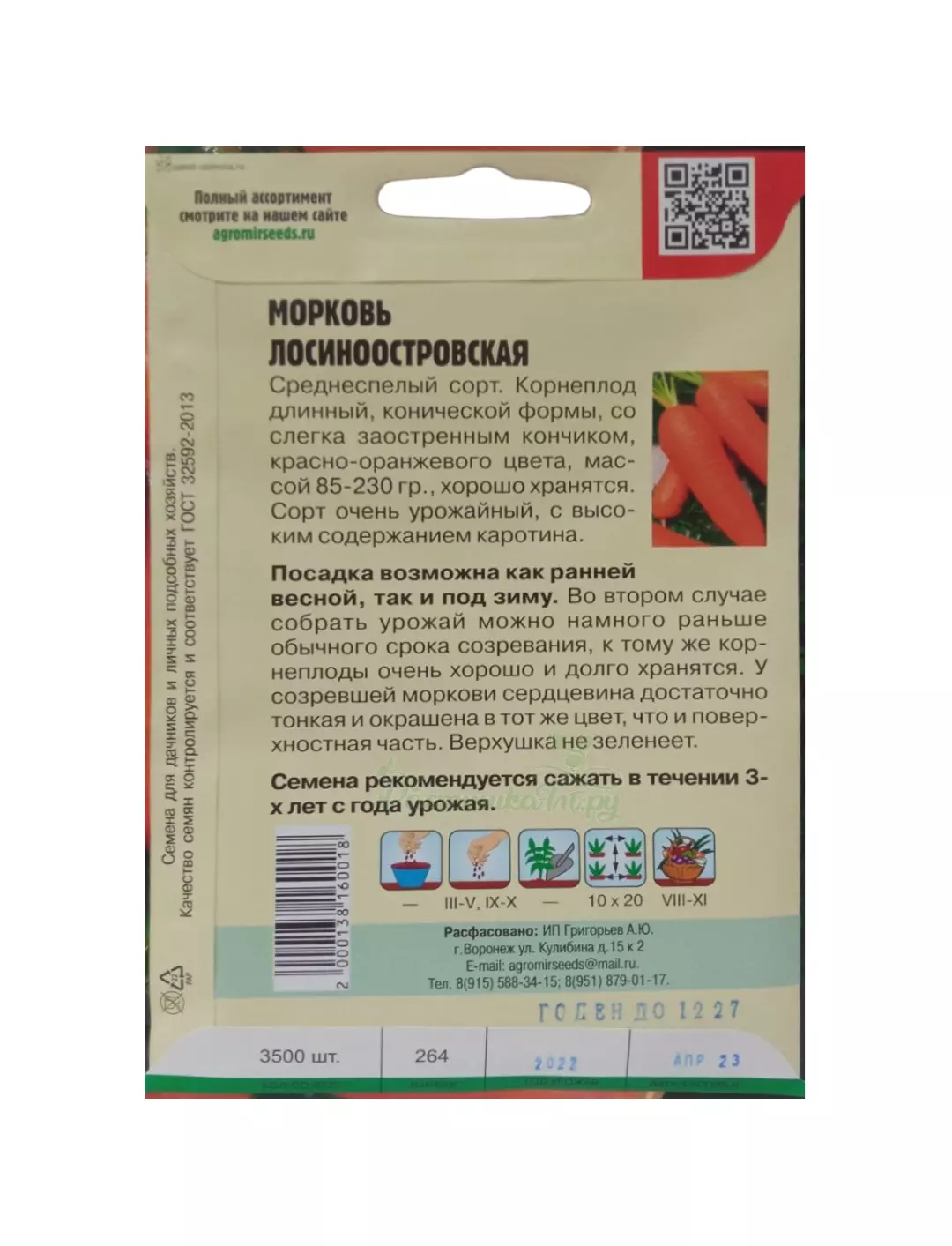 Лосиноостровская морковь имеет корнеплод цилиндрической формы, интенсивно–оранжевой окраски. Его длина от 15 до 20 см, масса 100 и более грамм. Эта разновидность обладает неоспоримыми плюсами: Мякоть довольно сочная, оранжевая. Сердцевина небольшая, ее цвет похож на цвет мякоти. Кончик тупой, поверхность имеет небольшие чечевиночки. Урожайность составляет до 6,5 кг. Лосиноостровская морковь почти не подвержена болезням. Устойчивая к стеблеванию. Она прекрасно переносит холод, из–за чего можно высевать под зиму. Сорт этот универсальный. Его прекрасные вкусовые качества позволяют применять морковь в детском питании и для заготовки соков.