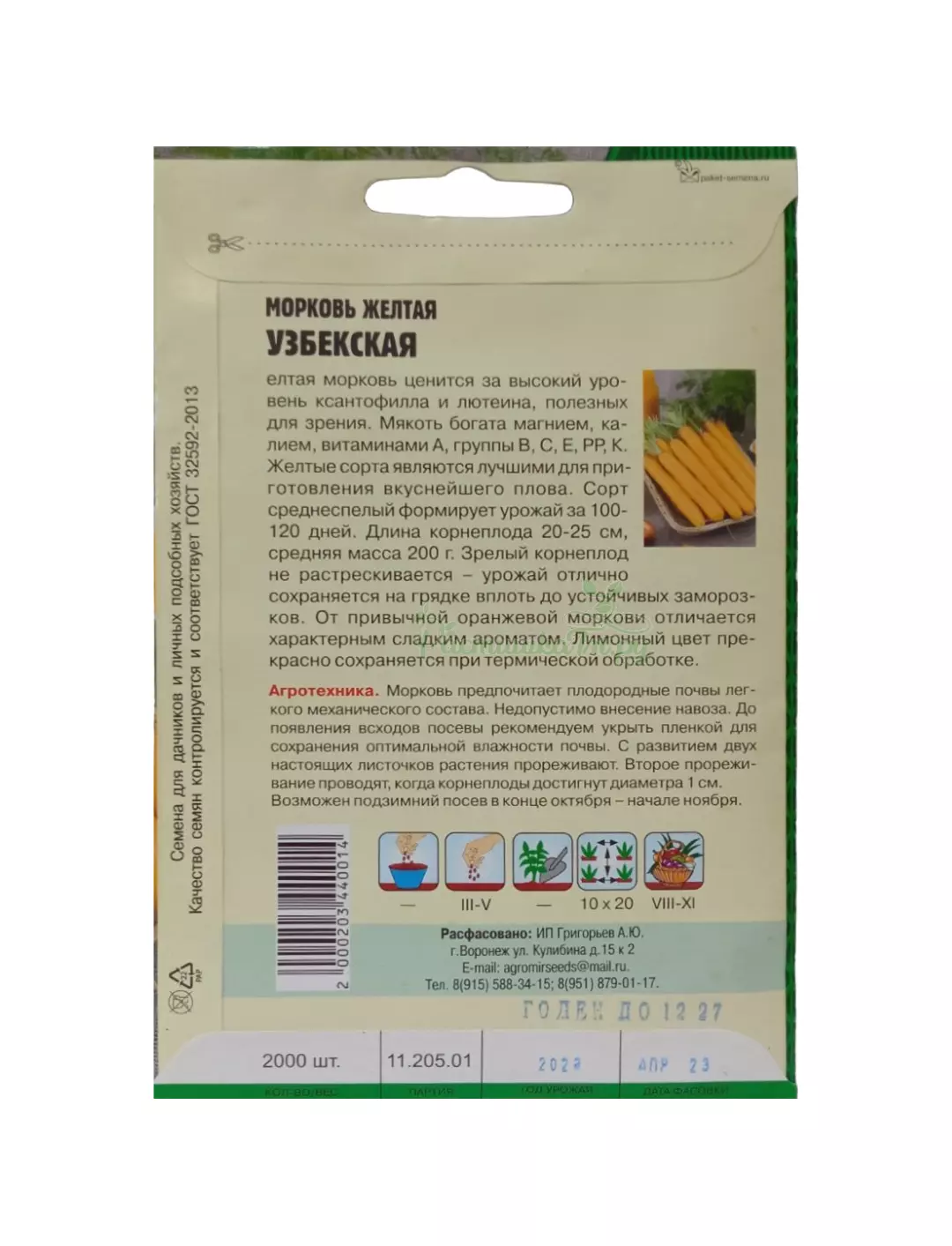 Сорт среднеспелый, формирует урожай за 100-120 дней. Длина корнеплода 20-25 см, средняя масса 200 гр. Зрелый корнеплод не растрескивается - урожай отлично сохраняется на грядке вплоть до устойчивых заморозков. От привычной оранжевой моркови отличается характерным сладким ароматом. Лимонный цвет прекрасно сохраняется при термической обработке.