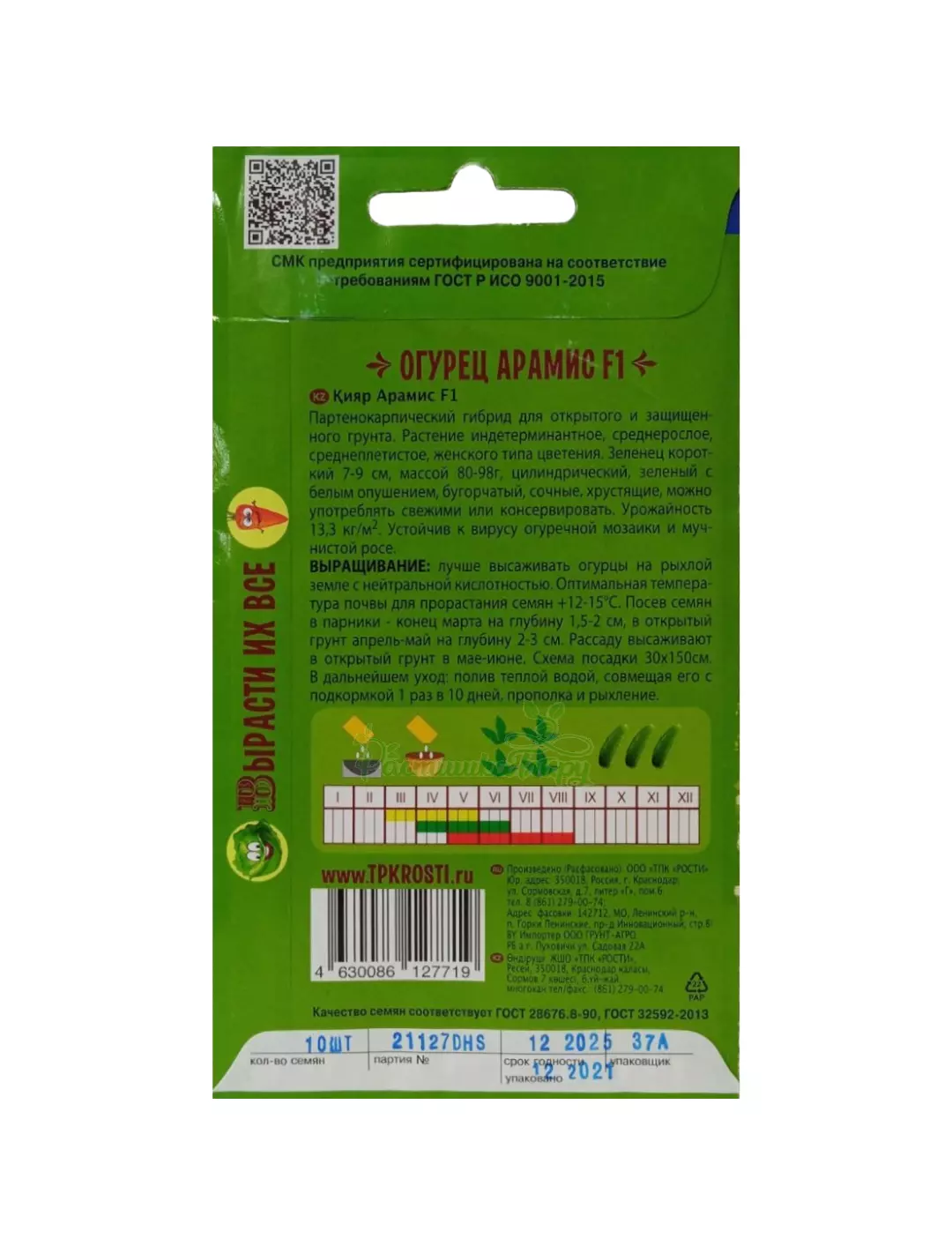 Партенокарпический гибрид для открытого и защищенного грунта. Зеленец короткий 7-9 см, массой 80-98г, цилиндрический, зеленый, бугорчатый, сочный, хрустящий, можно употреблять свежими или консервировать. Устойчив к вирусу огуречной мозаики и мучнистой росе.