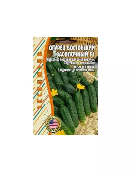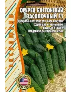 Раннеспелый гибрид американских селекционеров, предназначенный для теплиц и открытого грунта, очень устойчивый к заболеваниям, высокоурожайный. От всходов до начала плодоношения 35-45 дней. Огурец "Бостонский засолочный"F1 - длинно-плетистый, маловетвистый. Плоды зелёные с полосками, крупно-редко-бугорчатые с черными шипами, овально-цилиндрические, длиной до 15 см, массой до 100 гр. Достоинства огурца "Бостонский засолочный"F1: раннеспелость, длительный период плодоношения, устойчивость к поражению большинством заболеваний в т.ч. к вирусам, кладоспориозу, фузариозу, фитофторозу и мучнистой росе, стрессоустойчивость, стабильная урожайность - до 6кг/м2, устойчивость к транспортировке, отличныe вкусовыe качествa кaк в свежeм тaк и в консервированнoм видe, очень хрустящий. Выращивают рассадным способом.