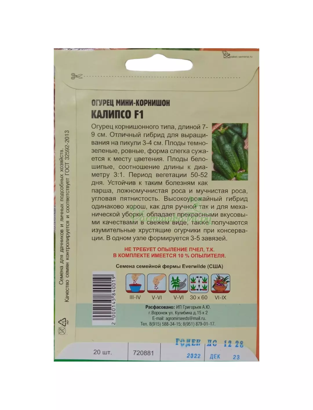 КАЛИПСО F1 - огурец корнишонного типа, длиной 7-9 см. Отличный гибрид для выращивания на пикули 3-4 см. Плоды темно-зеленые, ровные, форма слегка сужается к месту цветения. Плоды белошипые, соотношение длины к диаметру 3:1. Период вегетации 50-52 дня. Устойчив к таким болезням как парша, ложномучнистая роса и мучнистая роса, угловая пятнистость. Высокоурожайный гибрид одинаково хорош, как для ручной так и для механической уборки, обладает прекрасными вкусовыми качествами в свежем виде, также получаются изумительные хрустящие огурчики при консервации. В одном узле формируется 3-5 завязей.
