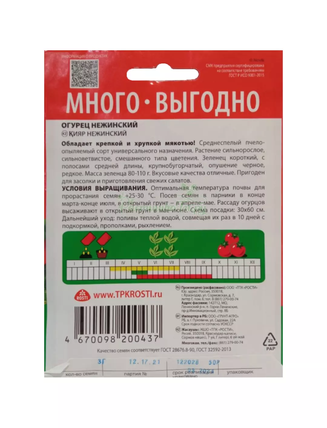 Среднеспелый пчелоопыляемый сорт универсального назначения. Растение сильнорослое, сильноветвистое, смешанного типа цветения. Зеленец короткий, с полосами средней длины, крупнобугорчатый, опушение черное, редкое. Масса зеленца 80-110 г. Вкусовые качества отличные. Пригоден для засолки и приготовления свежих салатов.