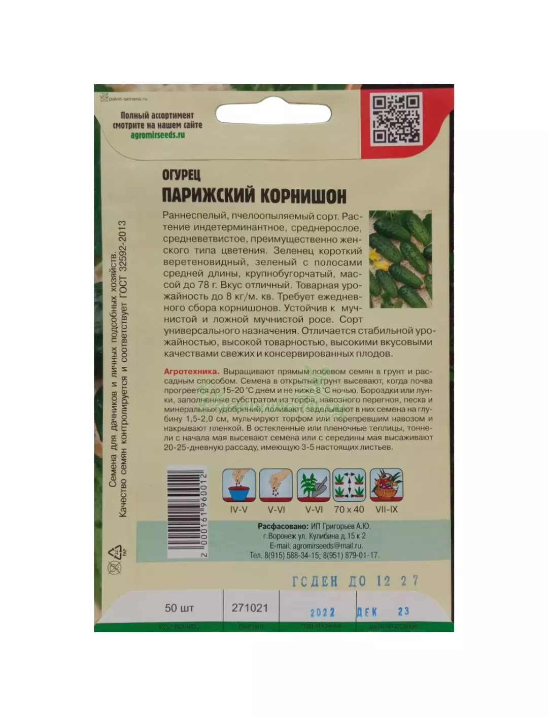 Раннеспелый, пчелоопыляемый сорт. Растение среднерослое, средневетвистое, преимущественно женского типа цветения. Зеленец короткий веретеновидный, зеленый с полосами средней длины, крупнобугорчатый, массой до 78 г. Вкус отличный. Товарная урожайность до 8 кг/м.кв. Требует ежедневного сбора корнишонов. Устойчив к мучнистой и ложной мучнистой росе. Сорт универсального назначения. Отличается стабильной урожайностью, высокой товарностью, высокими вкусовыми качествами свежих и консервированных плодов