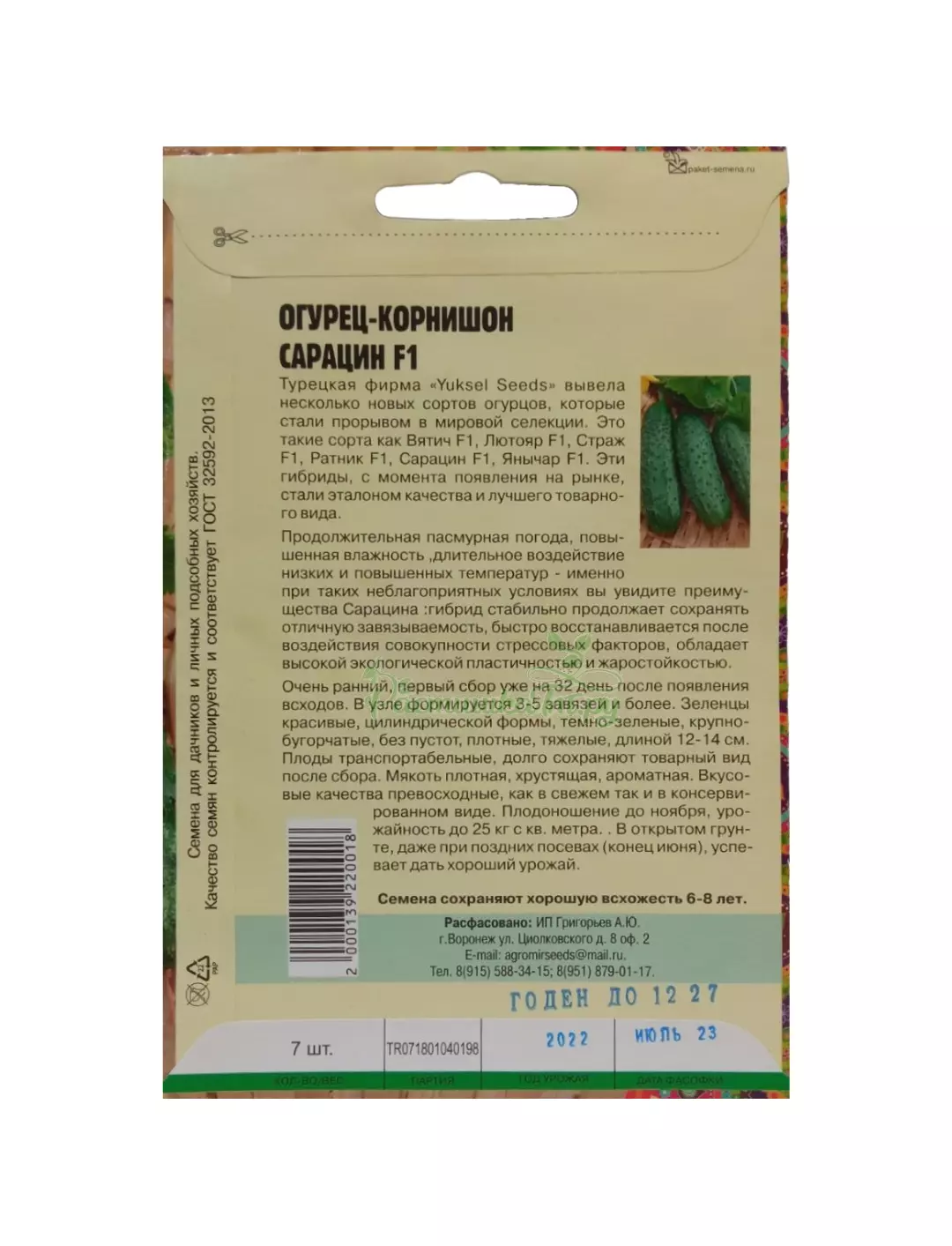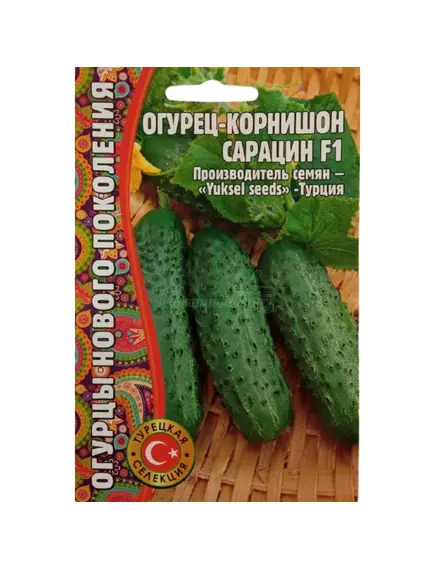 Огурец Сарацин F1 - это гибрид огурца раннего срока созревания, выведенный в Турции селекционерами фирмы Юксел Сидс (Yuksel Seeds). Зеленцы цилиндрической формы, среднебугорчатые, длиной 12 — 15 см, массой 80 — 90 грамм. Кожица плотная, тонкая, темно-зеленая, без белых полосок. Опушение очень частое. Шипы белые, колючие. Мякоть вкусная, ароматная. Урожайность товарных плодов в первый месяц плодоношения — 10 — 11 кг/кв.м, за весь период вегетации — около 20 кг/кв.м. Сорт салатный, но подойдет и для заготовок на зиму. Для консервирования плоды лучше снимать в стадии корнишона.