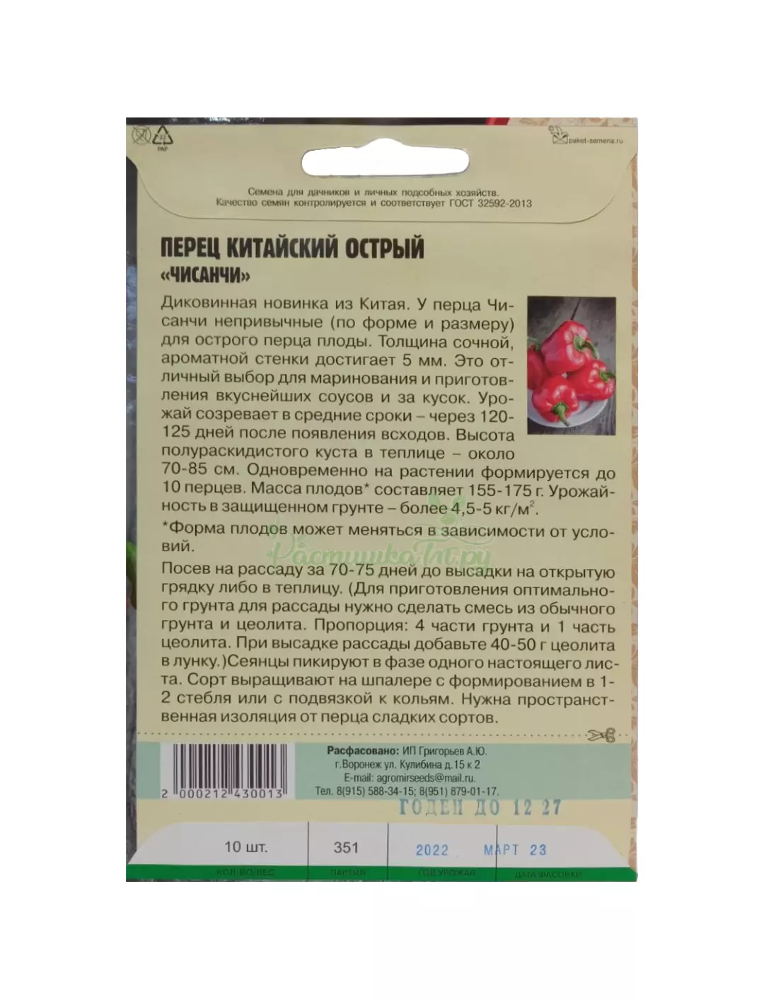 Диковинная новинка из Китая. У перца Чисанчи непривычные (по форме и размеру) для острого перца плоды. Толщина сочной, ароматной стенки достигает 5мм. Это отличный выбор для маринования и приготовления вкуснейших соусов и закусок. Урожай созревает в средние сроки - через 120-125дней после появления всходов. Высота полураскидистого куста в теплице — около 70-85см. Одновременно на растении формируется до 10перцев. Масса плодов составляет 155- 175г. Урожайность в защищенном грунте - более 4,5-5кг/м2. Форма плодов может меняться в зависимости от условий.