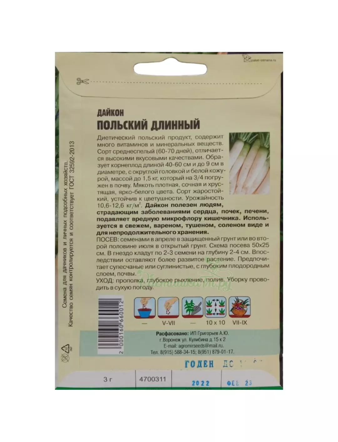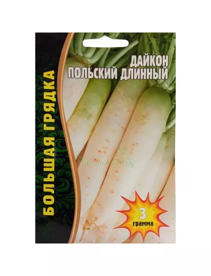 Сорт среднеспелый (60-70 дней), отличается высокими вкусовыми качествами. Образует корнеплод длиной 40-60 см и до 9 см в диаметре, с округлой головкой и белой кожурой, массой до 1,5 кг, который на 3/4 погружен в почву. Мякоть плотная, сочная и хрустящая, ярко-белого цвета. Сорт жаростойкий, устойчив к цветушности. Урожайность 10,6-12,6 кг/м . Дайкон полезен людям, страдающим заболеваниями сердца, почек, печени, подавляет вредную микрофлору кишечника. Используется в свежем, вареном, тушеном, соленом виде и для непродолжительного хранения.
