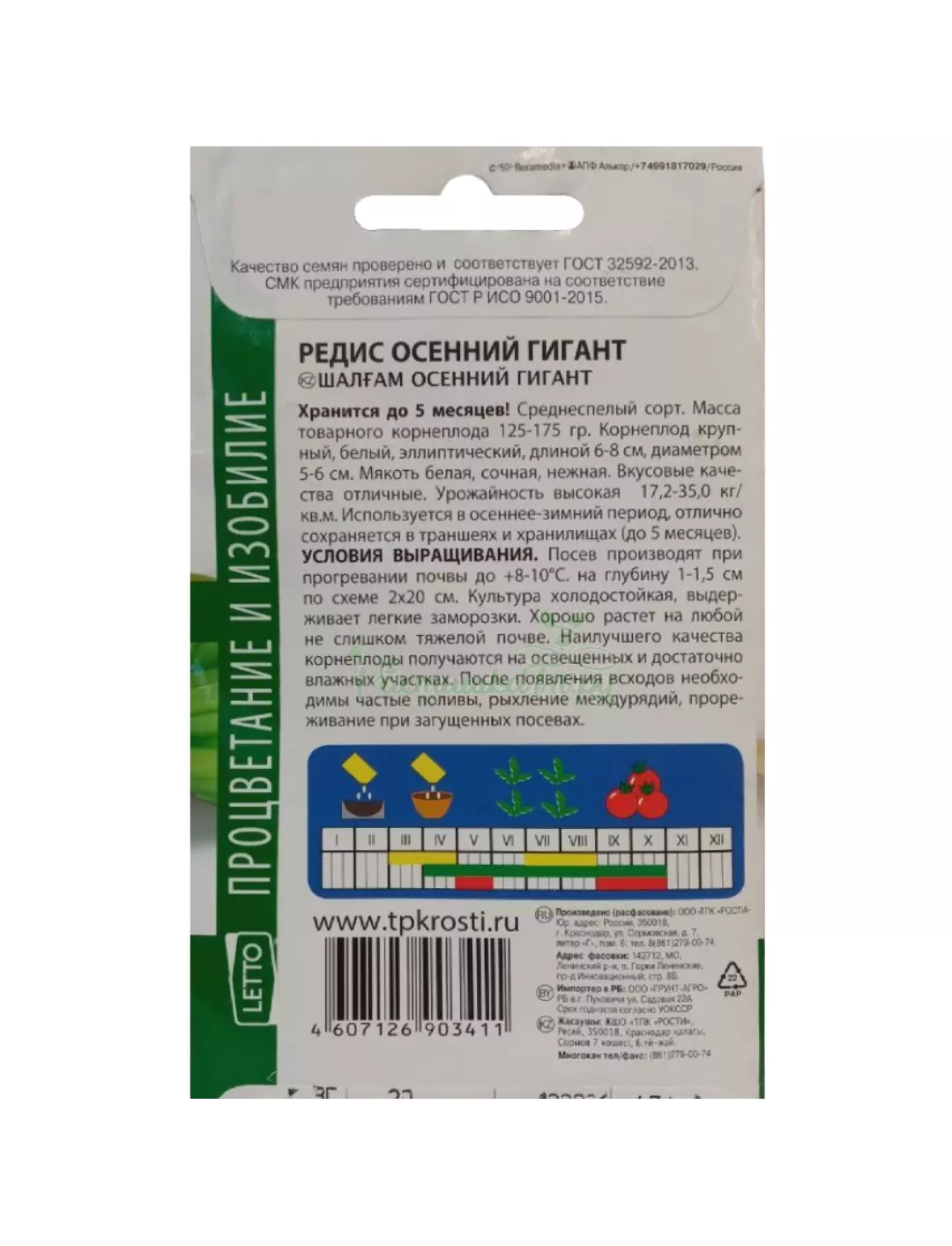 Среднеспелый сорт. Масса корнеплода 125-175 гр. Корнеплод крупный, белый, эллиптический, длиной 6-8 см, диаметром 5-6 см. Мякоть белая, сочная, нежная. Вкусовые качества отличные. Урожайность высокая 17,2-35,0 кг/ кв.м. Используется в осеннее-зимний период, отлично сохраняется в траншеях и хранилищах (до 5 месяцев)
