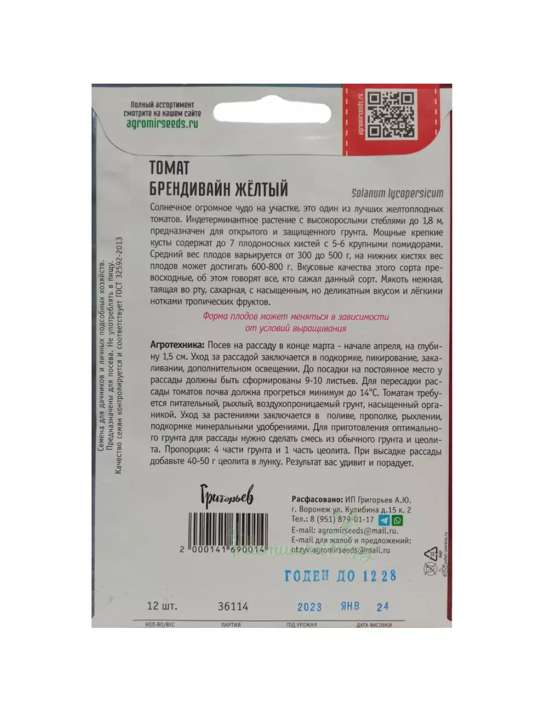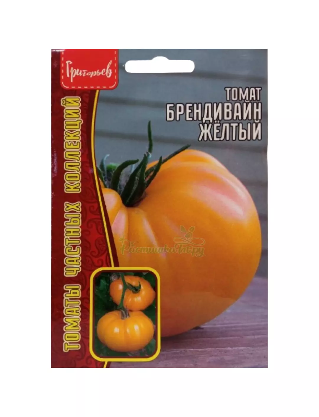 Томат Брендивайн желтый – солнечное огромное чудо на участке. Урожайный гибрид предназначен для открытого и защищенного грунта. Брендивайн желтый – индетерминантное растение с высокорослыми стеблями до 1,8 м., предназначен для открытого и защищенного грунта. Мощные крепкие кусты содержат до 7 плодоносных кистей с 5-6 крупными помидорами. Средний вес плодов варьируется от 300 до 500 г., на нижних кистях вес плодов может достигать 600-800г. Вкусовые качества этого сорта превосходные, об этом говорят все, кто сажал данный сорт. Мякоть нежная, таящая во рту, сахарная, с насыщенным, но деликатным вкусом, с лёгкими нотками тропических фруктов. Это один из лучших желтоплодных томатов. Выращивание через рассаду, семена сеют в 1-2 декаде марта.