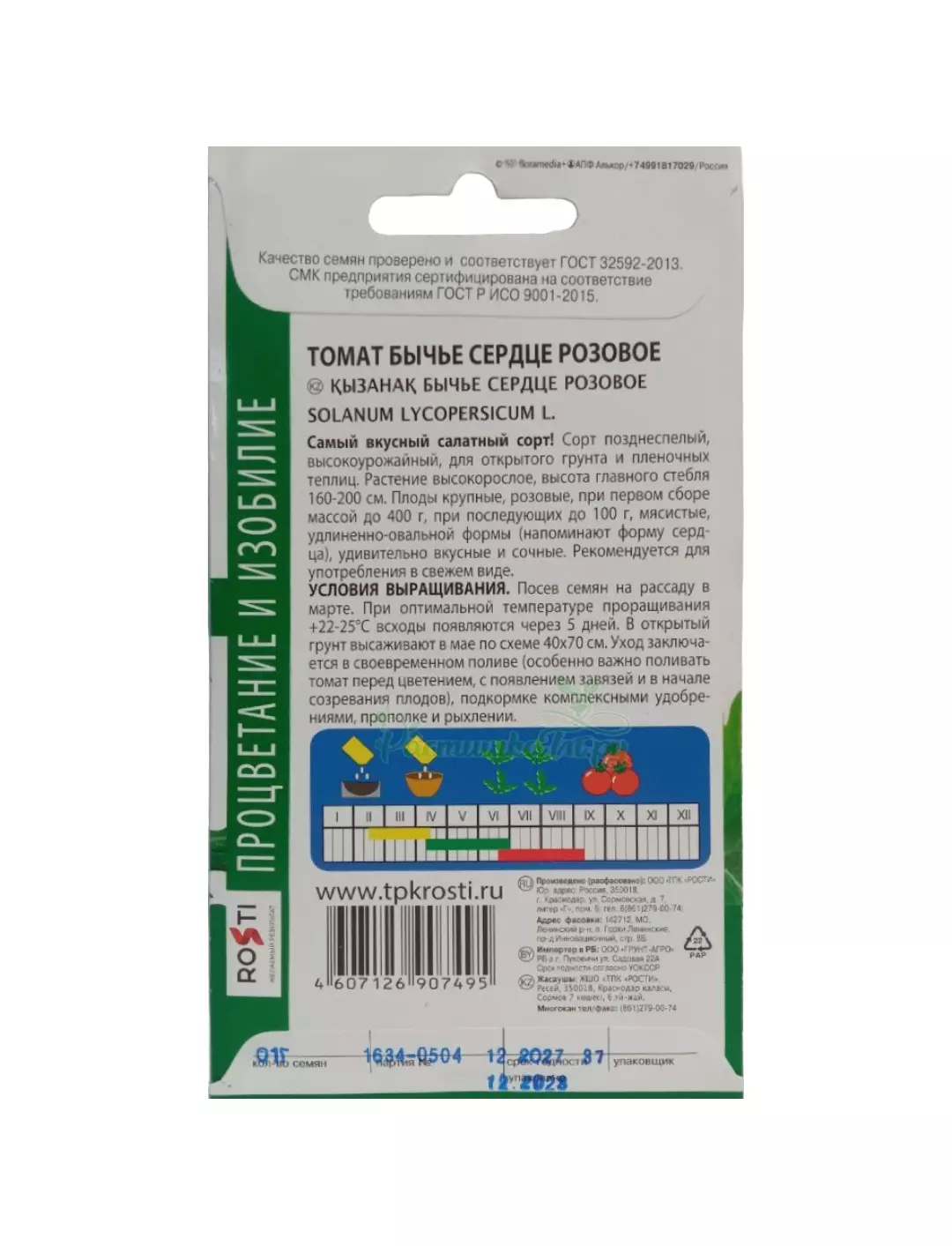Сорт позднеспелый, высокоурожайный, для открытого грунта и пленочных теплиц. Растение высокорослое, высота главного стебля 160-200 см. Плоды крупные, розовые, при первом сборе массой до 400 г, при последующих до 100 г, мясистые, удлиненно-овальной формы (напоминают форму сердца), удивительно вкусные и сочные. Рекомендуется для употребления в свежем виде.