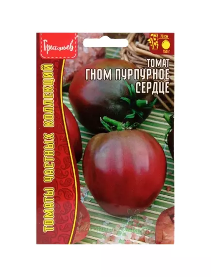 Томат Гном Пурпурное Сердце - это удачное сочетание низкорослости и крупноплодности. Это среднеспелый (период созревания 100-105 дней), детерминантный высотой до 50-70 см, не требуют пасынкования до первой кисти, предназначенный для выращивания в открытом грунте или под пленочным укрытием. Плоды сердцевидной формы, созревая становятся пурпурно-красными, весят от 100 до 200 граммов. Они мясистые и малосеменные, с очень хорошим вкусом и ароматом. Лучше всего подходят для употребления в свежем виде и приготовления соков. С одного куста можно собрать до 2 килограммов плодов. Гном Пурпурное Сердце отличается не только вкусовыми качествами, но и простотой в уходе, а также дружным плодоношением.