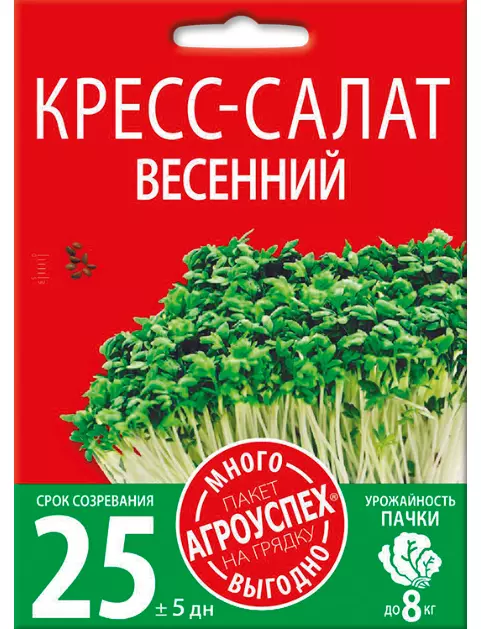 Быстрое формирование урожая. Период от полных всходов до начала хозяйственной годности 20-25 дней. Выращивают как самостоятельную культуру. Лист крупный, слабоволнистый, светло-зеленый. Вкус нежный, сочный, с горчичным вкусом . Кресс богат витаминами и микроэлементами. Отличается неприхотливостью. Подходит для выращивания на подоконнике и балконе при условии достаточной освещенности. Хорошая витаминная добавка в зимний и ранневесенний период.