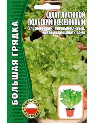 Ценится за превосходные вкусовые качества и скороспелость. Первые урожаи можно получить уже спустя 35-40 дней после посева. Листья, насыщенного зеленого окраса, отличаются исключительной декоративностью. Консистенция листа маслянистая, нежная, с высоким содержанием полезных биологически активных веществ. Листья срывают в течение всей вегетации по мере отрастания. Урожайность 3,2 кг/м2. Рекомендуется для выращивания не только в открытом и защищенном грунте, но и дома в горшке при искусственном освещении.