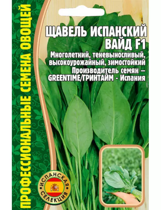 Щавель Вайд Г1 - среднеспелый урожайный гибрид широколистного щавеля испанской селекции, идеально подходит для супов и первых блюд. Вегетационный период - 40-45 дней от всходов до 1-й срезки
