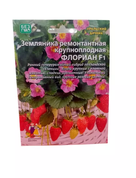Земляника Флориан F1 Ремонтантная является уникальным гибридом, который отличается крупными ярко-красными ягодами вес 20 гр с плотной мякотью. Они очень сладкие и ароматные. Также свойственна ярко выраженная ремонтантность, что обеспечивает высокий урожай - до 750-1000 гр с куста. Благодаря этому, плодоношение длится с мая по октябрь. Рано плодоносит благодаря хорошо зимующим розеткам, сформированным осенью. Он отличается исключительной декоративностью компактного куста, усыпанного ягодами и нежно-розовыми цветками.