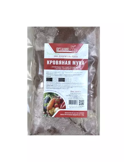 Действующее вещество:<br>• Кровяная мука обезжиренная мелкого помола.<br>• N 13%.<br>• K.<br>• Ca.<br>• Fe.