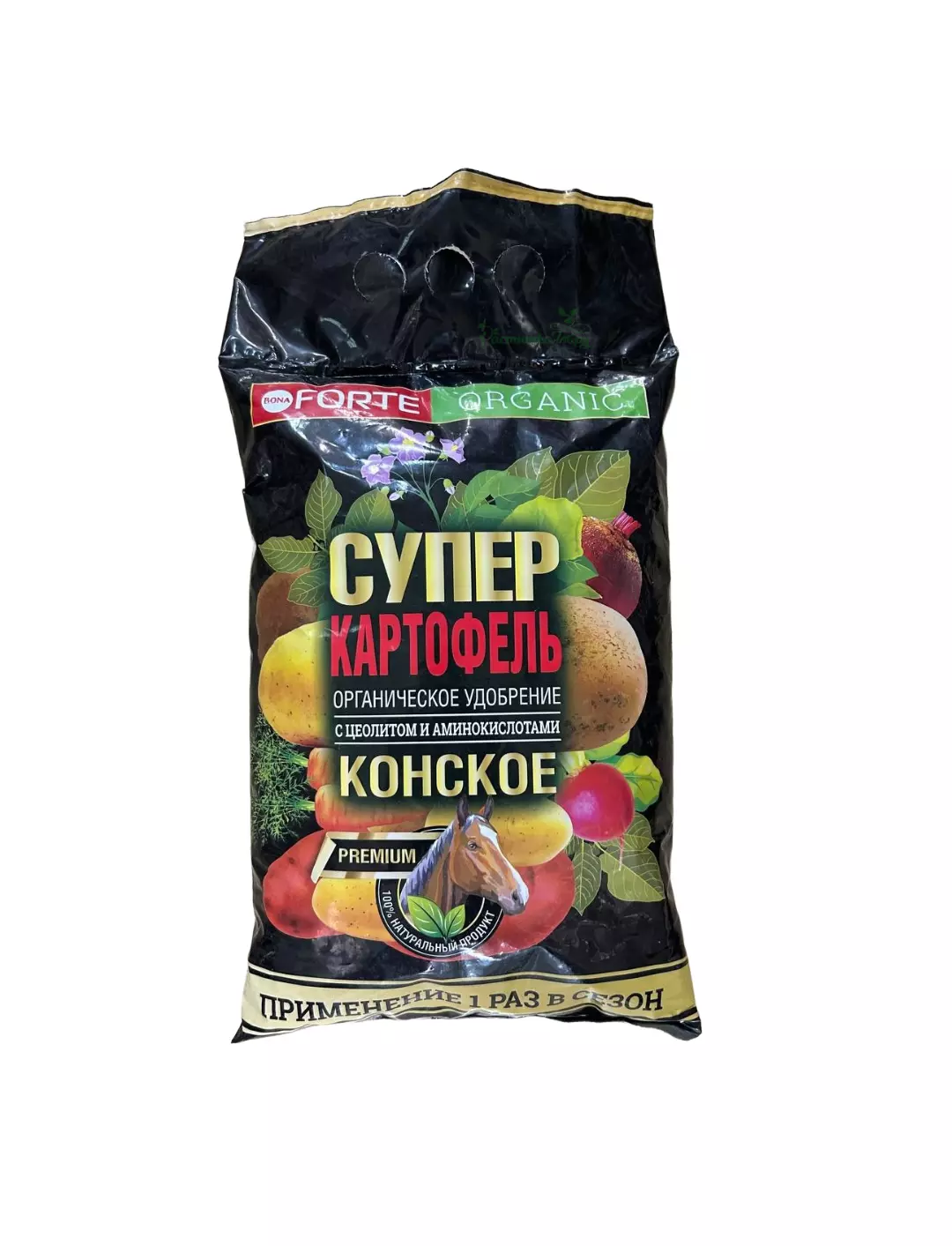 - Состав: Основа — переработанный конский навоз (высококачественная органика), обогащенный необходимыми макро- (N-P-K) и микроэлементами (часто с акцентом на калий для формирования клубней).