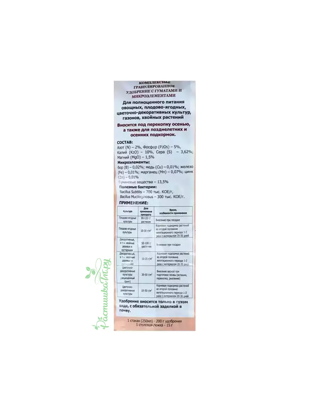 Другие преимущества Гранулированный состав продолжительного действия готов к применению. Добавляется в почву в сухом виде. Подходит для осенней обработки огородов, предназначенных для высадки разных культур, может использоваться на газонах, в садах, цветниках и при выращивании рассады. Применим в экологическом сельском хозяйстве.