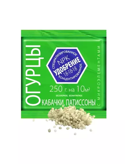 Это бесхлорное и безнитратное удобрение с микроэлементами, предназначенное для огурцов, кабачков и патиссонов. Содержит большое количество азота, фосфора и калия (NPK 18-18-18), что помогает растениям хорошо расти и плодоносить.