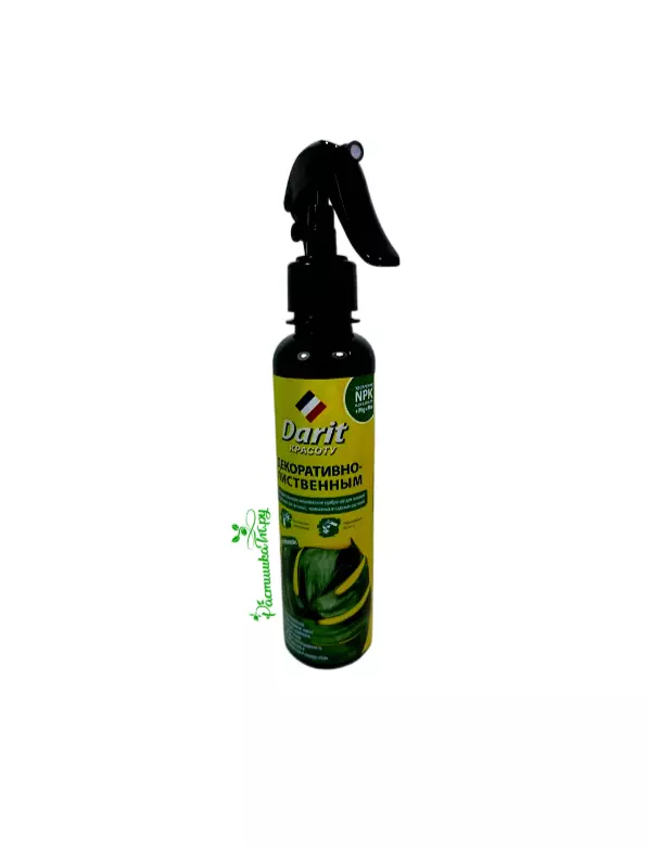 “Дарит” является инсектицидом для уничтожения летающих и ползающих насекомых, который используется для защиты растений внутри помещений, на улице и в оранжереях. Рекомендуется для избавления от вредителей на цветах и декоративных растениях, включая горшечные комнатные растения, от тлей, белокрылок, трипсов, щитовивок, ложных щитовивок и прочих вредителей. Препарат обладает приятным ароматом и не оставляет пятен на листьях и мебели.