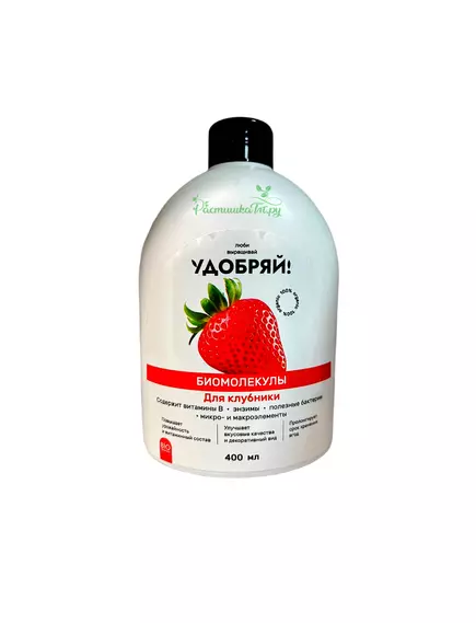 "Удобряй! Биомолекулы для клубники" – это высокоэффективное органическое удобрение, разработанное специально для полноценного питания и стимуляции роста садовой и ремонтантной клубники. Уникальная формула, обогащенная комплексом биомолекул природного происхождения, обеспечивает клубнике всё необходимое для обильного цветения, завязывания большого количества крупных, сладких ягод и укрепления иммунитета растения.