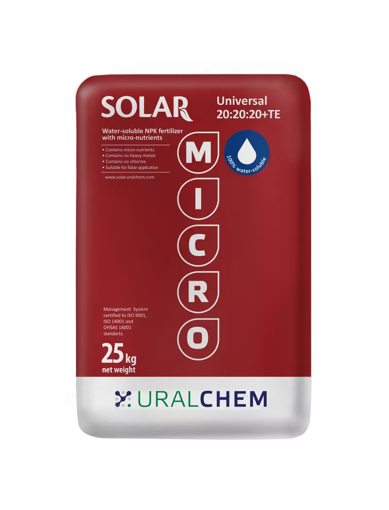 УРАЛХИМ SOLAR Универсал 20.20.20+МЭ – это высокоэффективное, полностью водорастворимое комплексное удобрение с идеально сбалансированной формулой NPK, предназначенное для универсального применения на всех стадиях развития растений. Благодаря равному содержанию азота, фосфора и калия, обогащенному полным комплексом микроэлементов в хелатной форме, это удобрение является незаменимым помощником для поддержания здорового роста, пышного цветения и формирования качественного урожая для широкого круга культур.