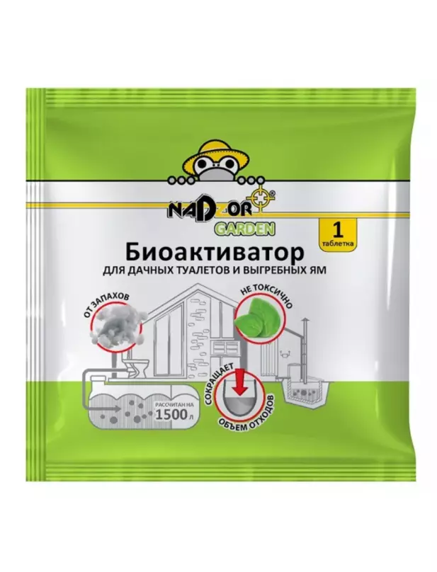 Биоактиватор Nadzor Garden используется для обработки выгребных ям и септиков. Он содержит микроорганизмы, которые эффективно разлагают органические отходы, превращая их в углекислый газ и воду, тем самым снижая объём твёрдых масс. Продукт эффективно работает при температуре от +10 до +35 С и выпускается в форме таблеток.
