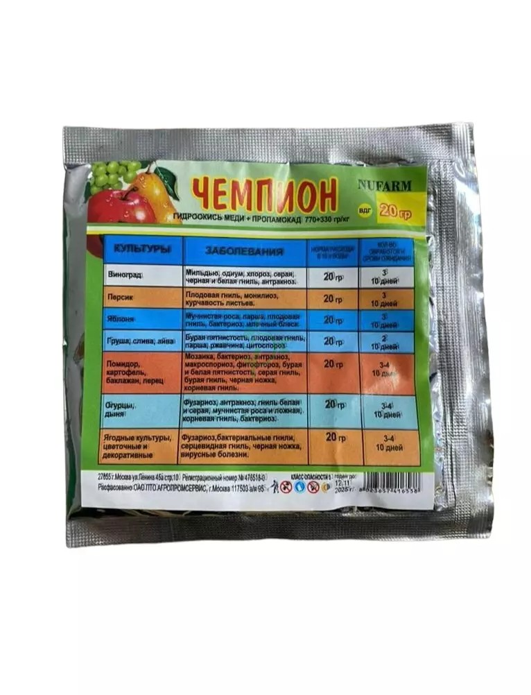 Фунгицид Чемпион - средство, применяемое в профилактических мероприятиях по борьбе с милдью винограда, курчавостью персика, макроспориозом и фитофторозом картофеля и томатов, пероноспорозом хмеля, яблоневой паршой. Помимо активного вещества в составе препарата содержится прилипатель, снижающий вероятность смывания при поливе и осадках. Особенно эффективный этот препарат, когда его используют в целях профилактики заболеваний растением.