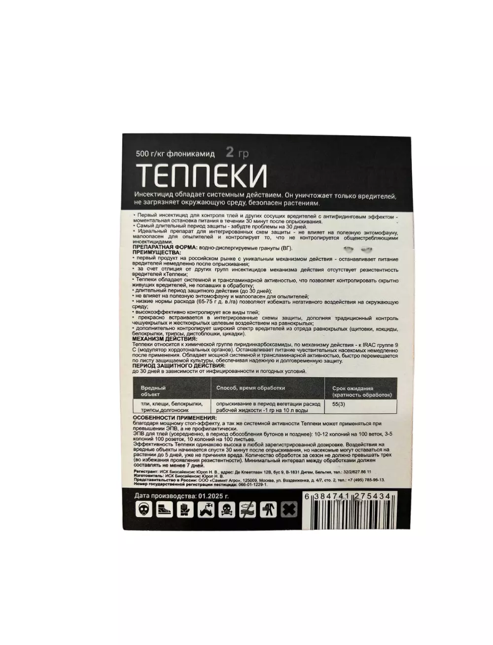 Средство от насекомых вредителей Теппеки 2г – первый продукт с уникальным механизмом действия! Теппеки эффективно помогает против большинства вредных насекомых на яблонях, смородине, плодовых деревьях, розах и цветах, а также на капусте и огурцах. Этот инсектицид борется с тлей, трипсами, щитовками, мучнистым червецом, и другими вредителями цветов и плодовых деревьев.