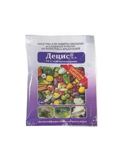 Средство “Децис” - это контактный инсектицид с кишечным действием. Оно имеет широкий диапазон воздействия, обеспечивая мгновенную защиту от жесткокрылых (насекомых), чешуекрылых (молей), равнокрылых (тли), большинства сетчатокрылых (златоглазки, осы), и двукрылых (муха).