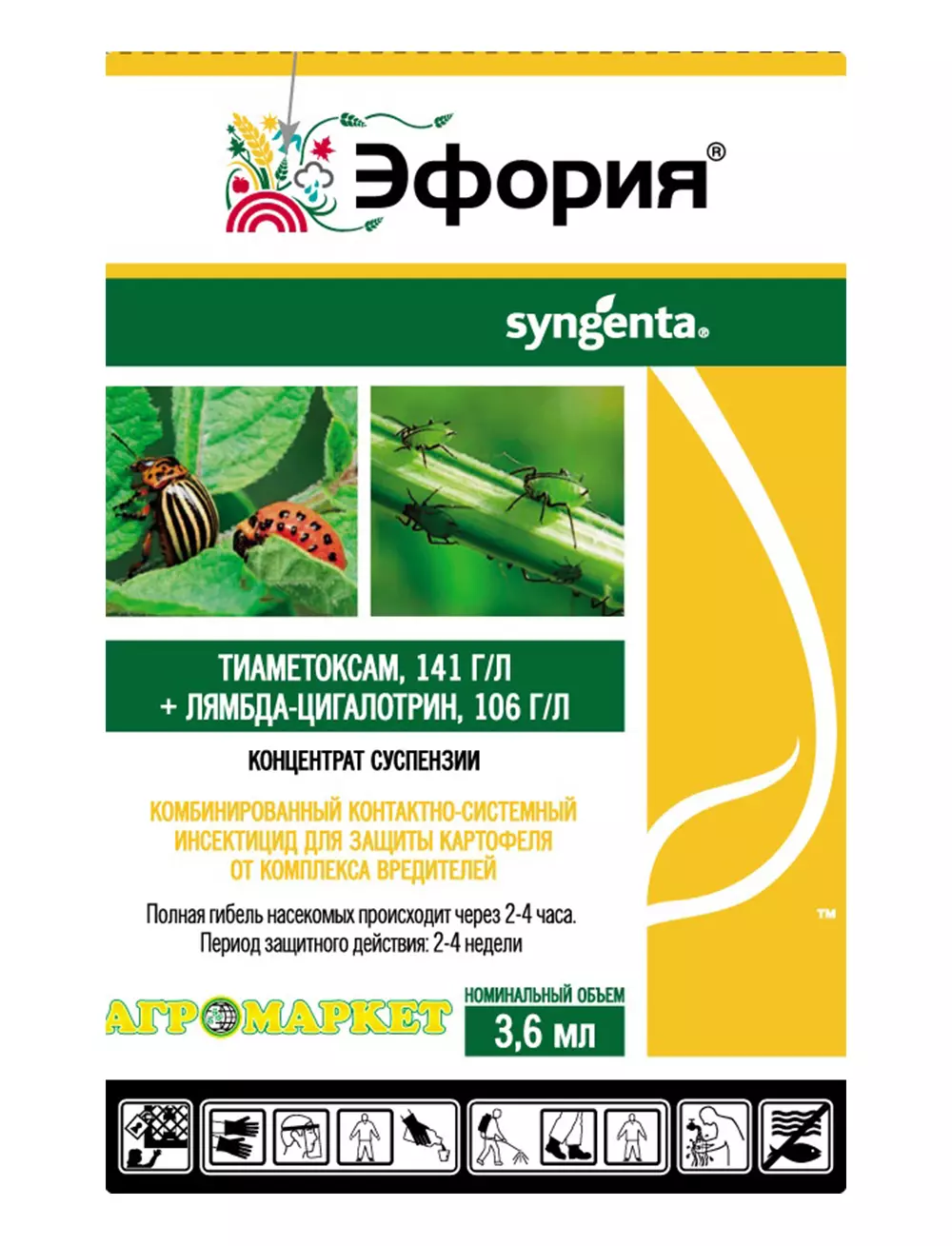 В состав препарата Эфория входит два действующих вещества — лямбда-цигалотрин и тиаметоксам. Эти вещества, относящиеся к двум различным химическим классам, полностью дополняют друг друга, обеспечивая максимальную и, что важно, продолжительную защиту от вредителей на поле, предотвращают риск возникновения резистентности.